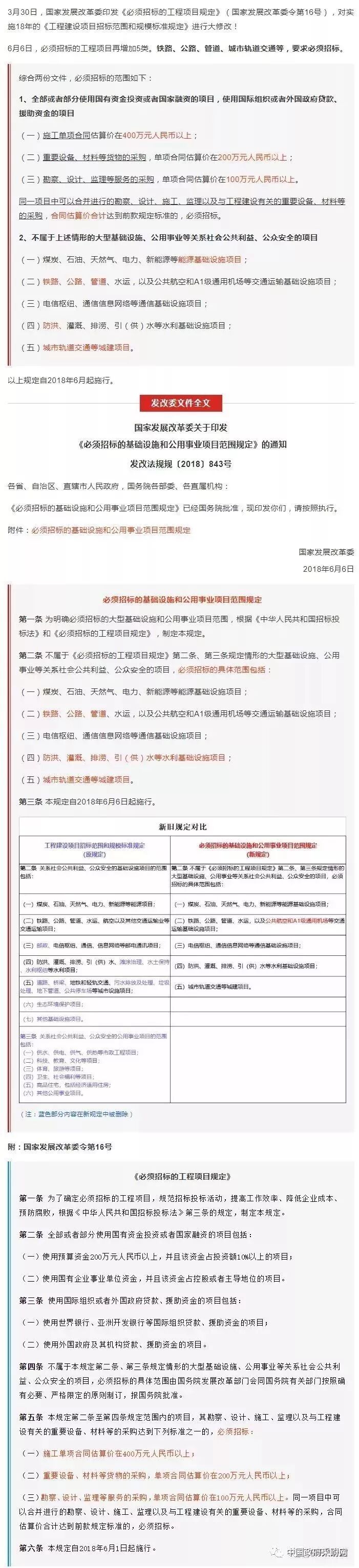 多个省市政府集中采购公开招标限额直接从200万上调至400万!文末附最新版《必须招标的工程项目规定》(国家发展改革委令第16号)全文解读!